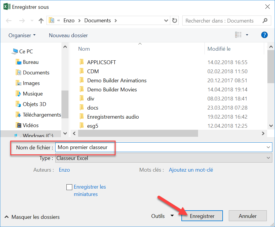 Lorsque vous enregistrez un classeur il est important de lui donner un nom assez clair et explicite et de l’enregistrer à un endroit de votre choix (éventuellement dans un sous-dossier), afin que vous puissiez le retrouver facilement. La boîte de dialogue Enregistrer sous se présente de la manière suivante :
