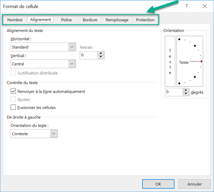 Il existent aussi des boîtes de dialogues plus complexes comme la boîte de dialogue Format de cellule, qui contient multiples options classées par onglets.